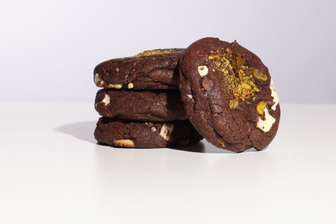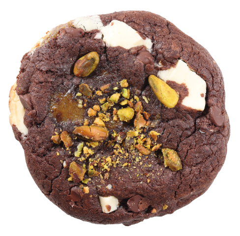 Double chocolate chip cookie with pistachio filling.